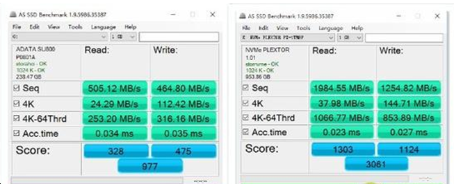 The gap of these two types of AS SSD running speed is obvious, whether read or write, or 4K test, PCI-E SSD are better than SATA SSD. The score of PCI-E SSD is higher 3 times than SATA SSD.