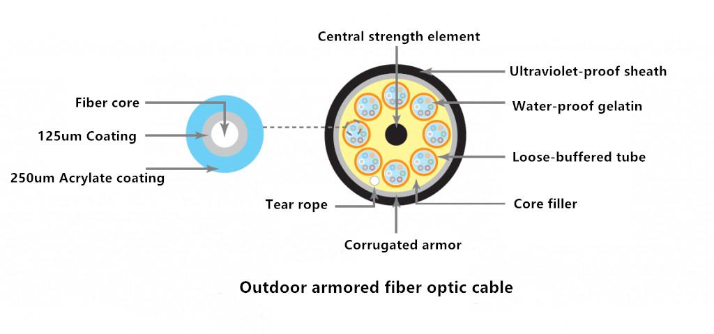 Outdoor armored fiber optic cable uses corrugated armor with high anti-stretch, high-pressure resistance, and high anti-rat bite. The following is its inner structure drawing: